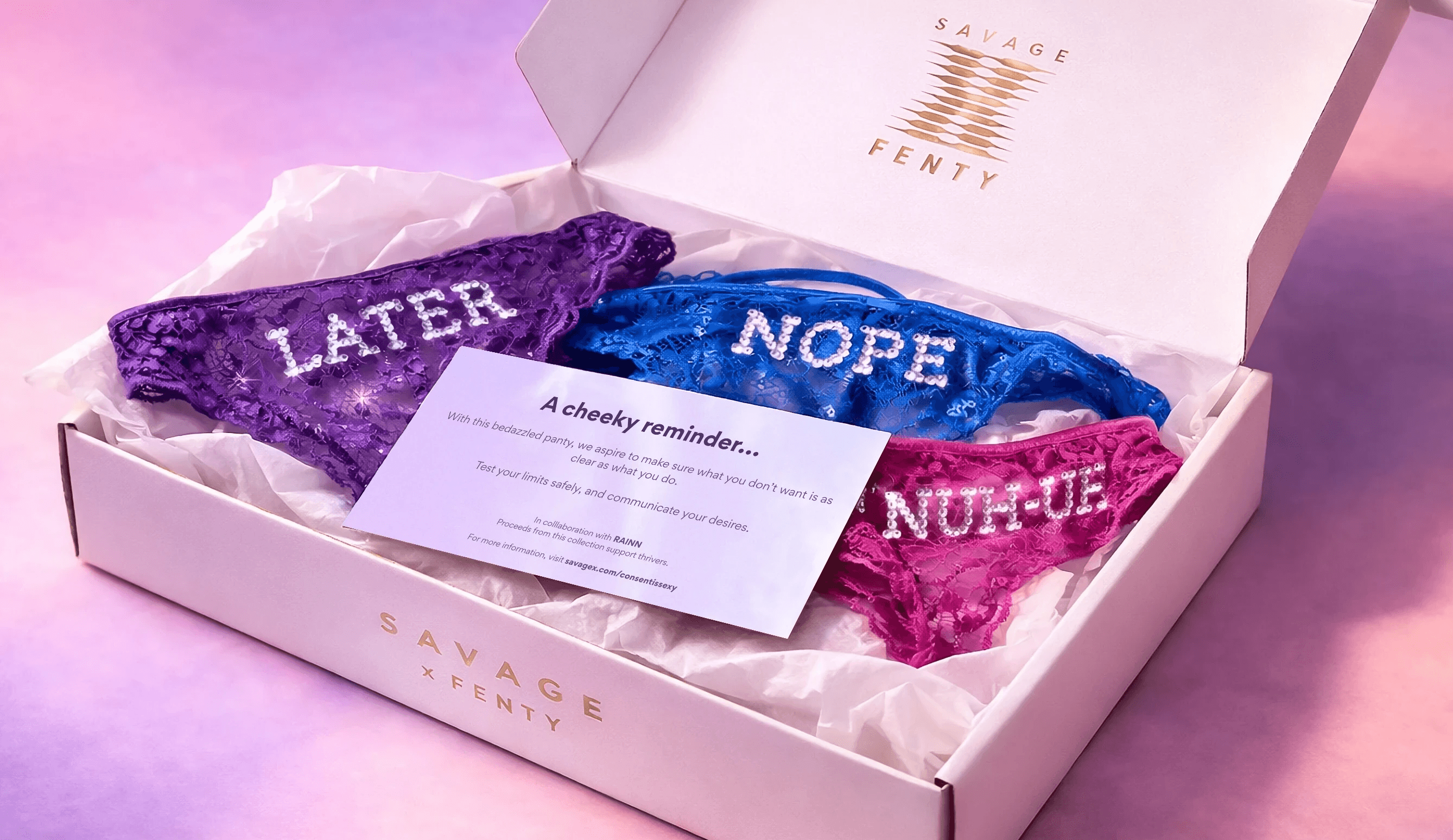 Each Savage Fenty order comes with a pair of bedazzled panties with consent cards to spark conversations around boundaries, desire, and respect.